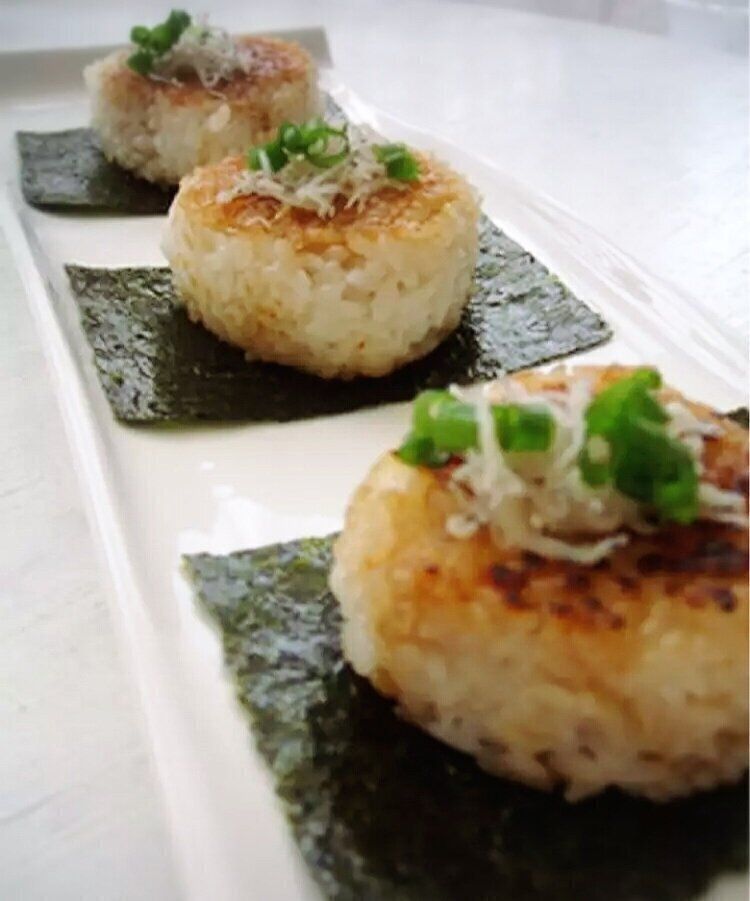 焼きおにぎりは、すぐにつくれるのでお酒の後や急な来客のときにも大活躍です。醤油とゴマ油のこんがりとした焼き目が、しらすとも相性バツグン。香ばしい味わいが食欲をそそります。