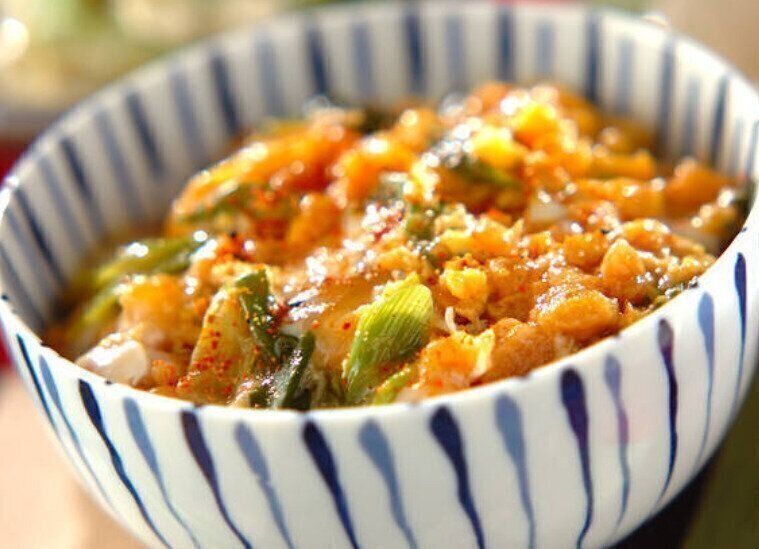 天かすを使うことで、揚げ物をしなくても天丼のような味わいに仕上がる、手軽な丼ものレシピです。しらすやネギとの相性もよく、冷蔵庫にあるものでつくれるのがポイント。七味唐辛子を振っていただきます。