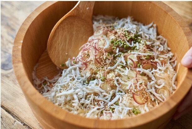 「ソラ豆とシラスごはん」は、ソラ豆としらすをいっしょに炊き上げてつくるごはん。ソラ豆のいい香りとしらすのほどよい塩味が絶妙なおいしさです。お好みで、しょうゆを加えて食べてみてくださいね。