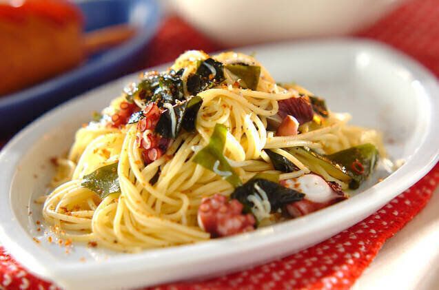 しらす干しにタコ、ワカメも入った和風パスタのレシピです。あれば仕上げにカラスミを削り、濃厚な味わいをプラス。あっさりとした味つけと、素材の旨みの組み合わせが魅力的です。