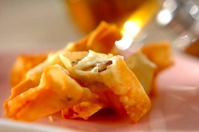 甘栗と2種類のチーズをワンタンの皮でキャンディ型に包んだ、揚げ物レシピ。おつまみにもぴったりな一品です。ハチミツやシナモンパウダーをつけて食べるのがおすすめ。ワインがすすみそうですね。