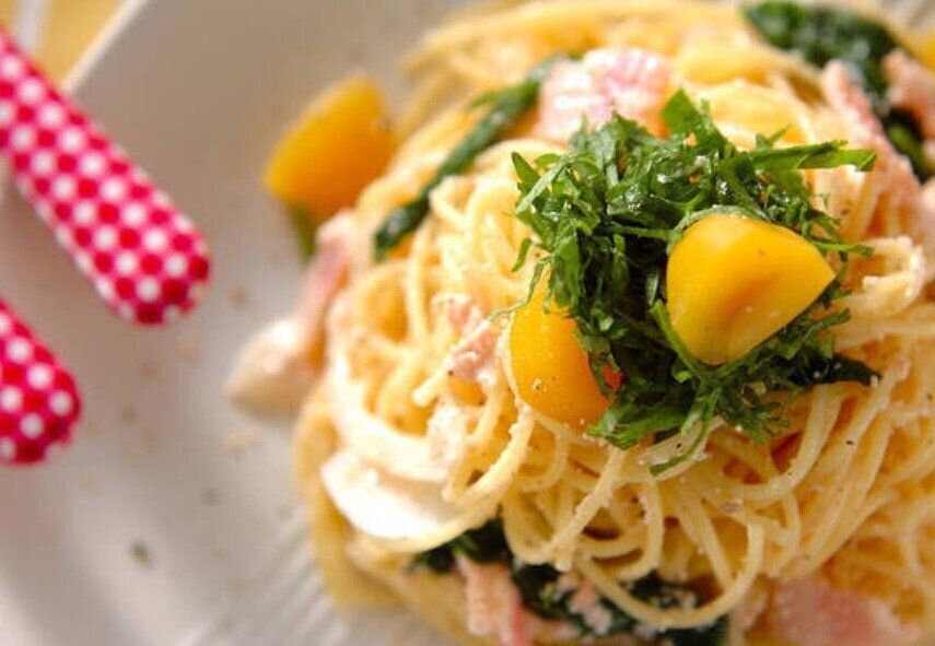 栗の甘露煮と、たらこクリームを組み合わせるという、ユニークなパスタのレシピ。栗がアクセントになって、食感や風味をプラスしてくれそうですね。大葉のトッピングで彩りもプラス。洋食のメイン料理におすすめです!