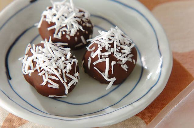 栗とチョコレートを使用した洋菓子レシピ。栗の甘露煮と、ほろ苦いビターチョコがよく合います。最後にココナッツロングをトッピングすれば、よいアクセントになりますよ。