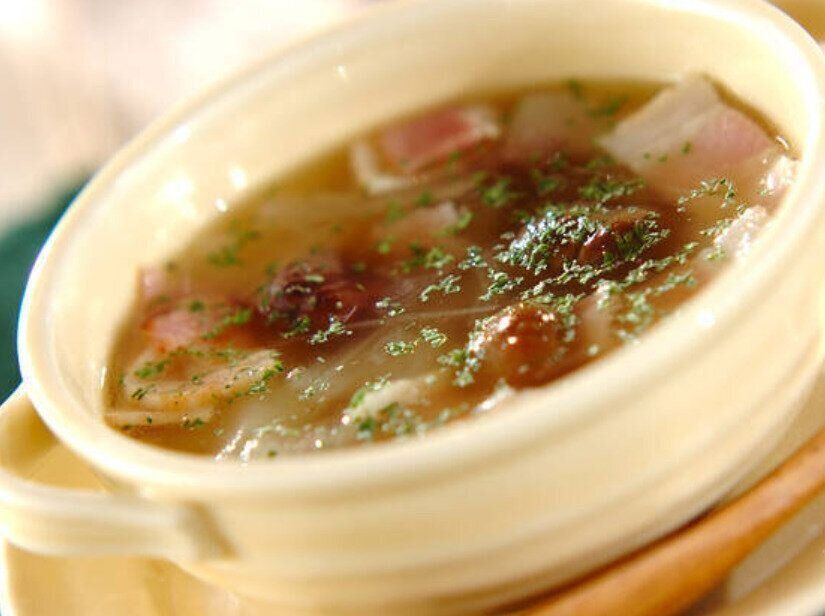 天津甘栗、ベーコン、玉ねぎを使ってつくるスープのレシピ。栗をスープにいれることで、ホクホク感を味わえそうです。洋風の味つけで、洋食メニューのつけ合わせにもぴったりですよ。