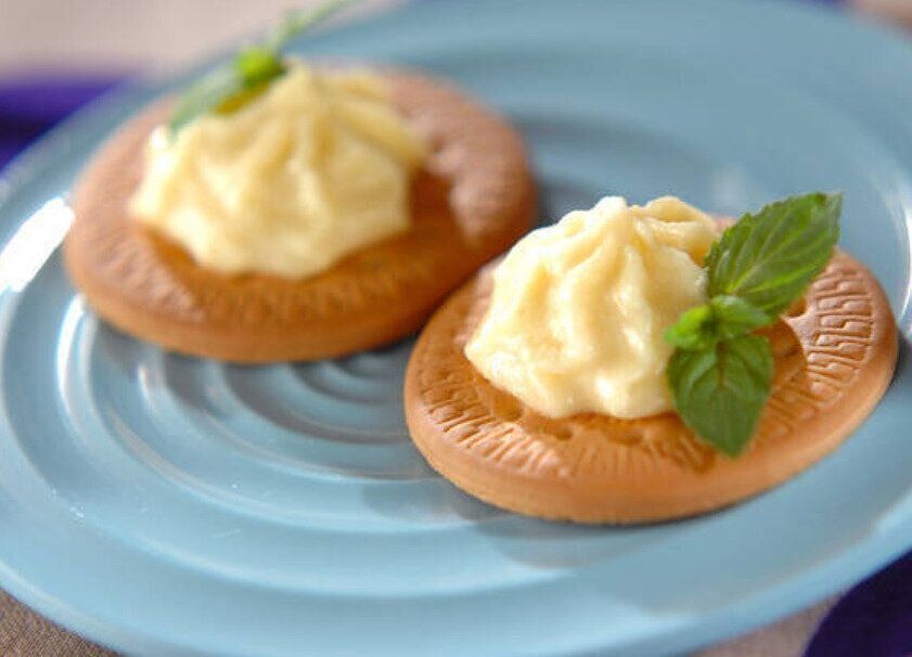 栗の甘露煮を5mm角に切り、マスカルポーネチーズとあえたら、こしあんをぬったビスケットにサンドするだけ。チーズと栗、こしあんの組み合わせが斬新です。甘いものが好きなかたにはおすすめ!