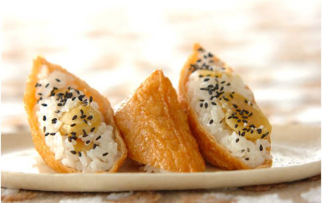 栗ともち米を使ってつくるレシピ栗おこわのおいなりさんです。もち米は炊飯をはじめる30分以上前に、水で洗いザルに上げておくことがポイント。行楽のお共にもピッタリの一品ですよ。