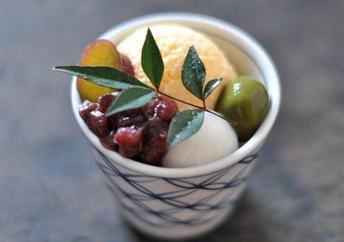 白玉団子やアイス、栗の甘露煮、さつまいもの甘露煮などを組み合わせた和風パフェ。お好みでいろいろな組み合わせで楽しむこともできます。抹茶アイスを入れてもおいしそう!
