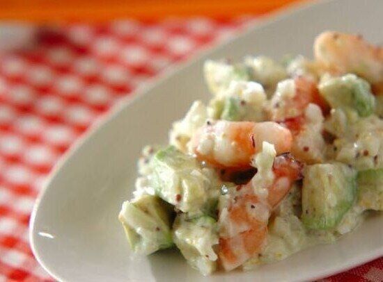 ヘルシーで女性に人気のエビアボカドサラダ。ドレッシングにはヨーグルトやマスタードなどを使っているので、まろやかで味も引き締まっています。下処理したエビを茹でて野菜といっしょにドレッシングと和えるだけという手軽さも良いですね。