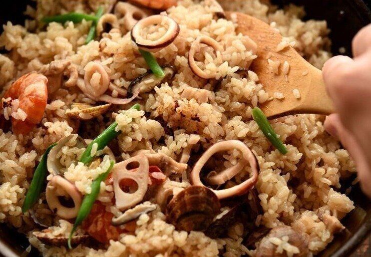 エビやイカ、アサリなどの魚介類がたっぷりと入った和風パエリア。オリーブオイルや昆布だしを使うことで和風の味つけになり、とても食べやすくなります。家族みんなでパエリアを囲んで夕食にするのもいいですね。