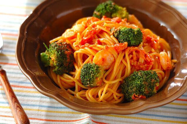 冷凍のむきエビやトマト缶などを使った、パスタのレシピ。エビ、ブロッコリーの食感も楽しめそうです。生クリームの代わりに牛乳を使ったり、チーズをプラスしたりしてもおいしそうですね!