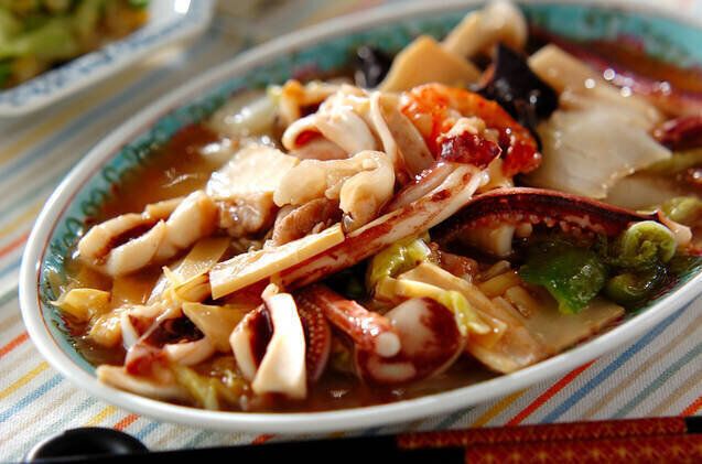 イカやエビ、お肉、野菜もたっぷり入れて味わう炒め物レシピです。中華の味つけでご飯によく合いそう。スープまで残さず、おいしく味わえそうです。冷蔵庫に余った食材をプラスしてもよいですね!