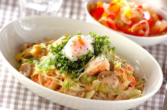 むきエビ、もしくは冷凍エビを加えてつくる、明太子クリーミースパゲティ。「明太ソース」に生クリームを加えるので、コク深い味わいを楽しめそう。ぷるぷるの温泉卵が麺にからんで、幸せ気分に浸れそうですね!