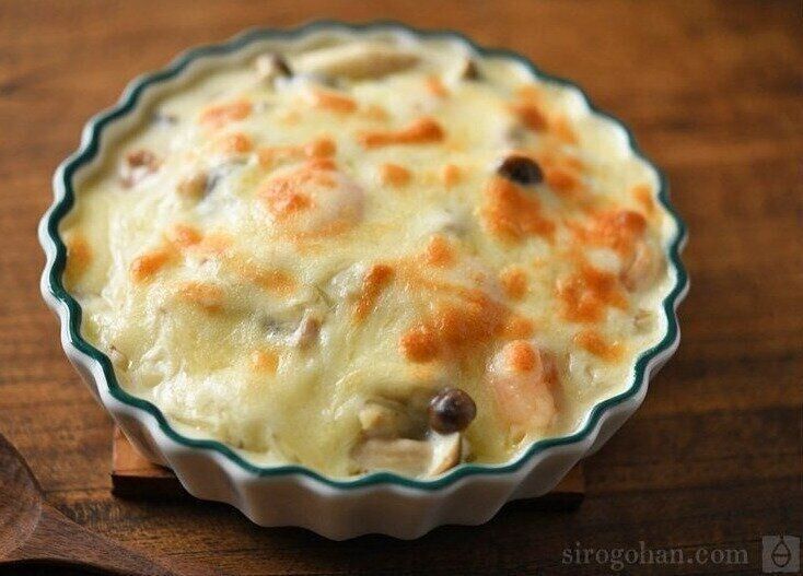 エビがたくさん入っていて、子どもから大人まで人気のマカロニグラタン。ホワイトソースにチーズを乗せてオーブンで焼くだけなので、簡単につくれます。牛乳を加える前に、小麦粉を加えて炒めておくと◎。