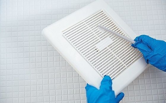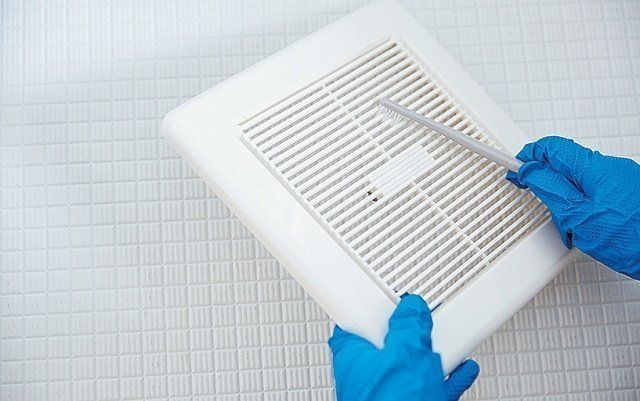 換気扇フィルターは、古歯ブラシをかけてほこりを落とし、水で洗い流す。汚れがひどいときは、Aをかけてブラッシング。ぞうきんでから拭きして取りつける。