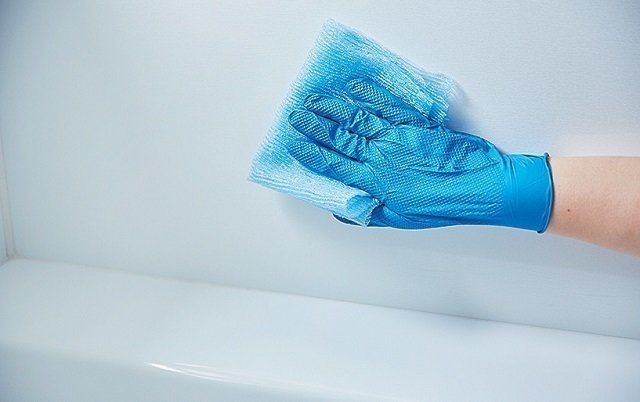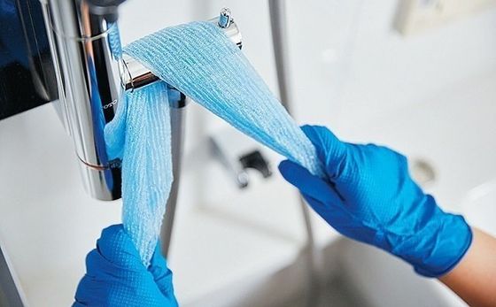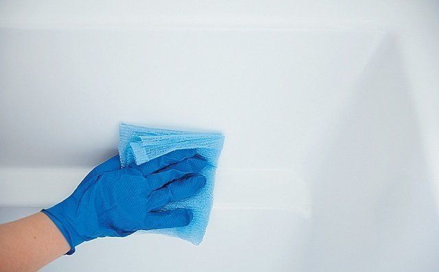水あかや石けんかすが落ちない場合は、Bを吹きかけてナイロンタオルでこすり洗いし、水で洗い流す。仕上げに全体をぞうきんでから拭きする。