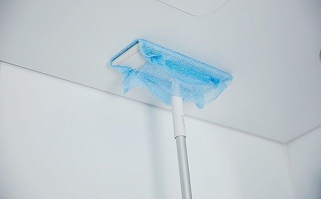 天井は、洗剤を泡立てると洗い流すのが大変なので、フロアモップにナイロンタオルをつけて水拭きを。汚れがひどい場合は、アルカリ電解水を含ませて拭く。
