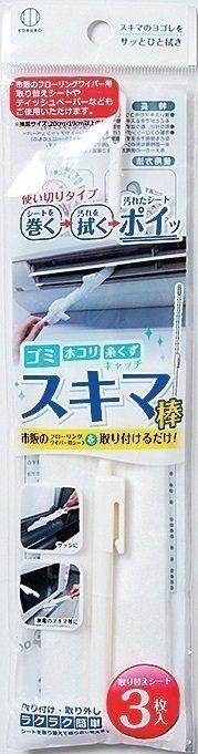 長い棒の先端に市販のフロアシートを引っ掛け、くるくると巻いて使うタイプ。家具の取っ手や、建具の窓枠など、微妙なへこみにたまったほこりを、スーッと落とすのが快感! / Can★Do