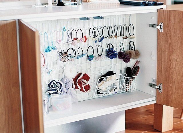 キッチン前面の背の低い扉に100均の網でヘアアクセサリーを収納。子どもたちが使いたいものを選んで、ママの元へ持ってきます。「お店みたいに、楽しんで出し入れしてくれます」。
