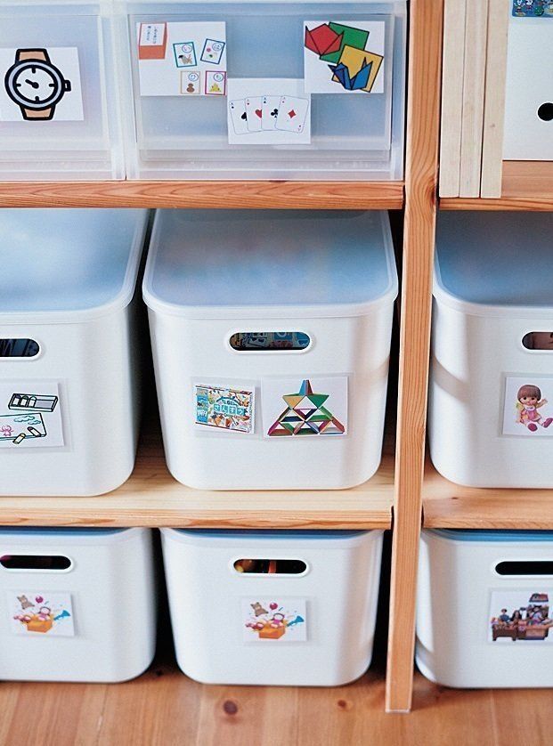 おもちゃは、お手製のラベルを貼った「無印良品」のケースに分類整理。定期的に見直してケースからあふれるのを防いでいますが、「私の価値観だけで勝手に捨てないように気をつけています」。