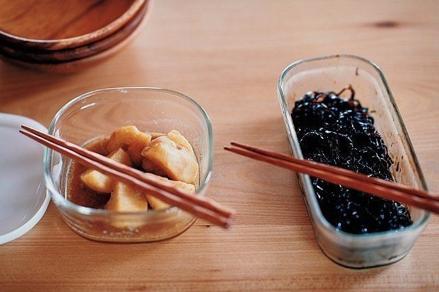 作り置きのおかずや漬けものなどは、「iwaki」の保存容器に入れて、そのまま食卓へ。ちゃんと取り箸を添えれば、ふたをしてまた冷蔵庫に戻せるので、洗い物の削減にも貢献!