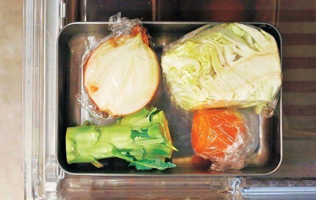 余った野菜や切れ端をトレーにのせ、野菜室内でひとまとめに。みそ汁の具はここから使うと決めておけば、みそ汁の具に悩むことなし!野菜もムダなく使い切れます。(インスタグラマー MAYAさん)