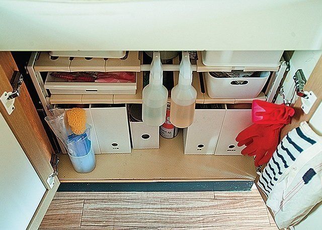 シンク下のスペースには、扉の右半分側に排水口フィルターなど、毎日使うものを配置しています。右ききなので、右側にまとめたほうがスムーズに取り出せ、時短になるんです。(インスタグラマー mariさん)