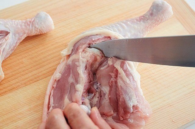 まな板に鶏肉の皮目を下にして置き、骨にそってくの字に切り込みを入れる。骨の関節部分にある軟骨(白い部分)に切り込みを入れる。Aを肉全体にすり込んで1時間ほどおく。