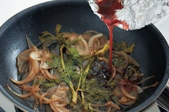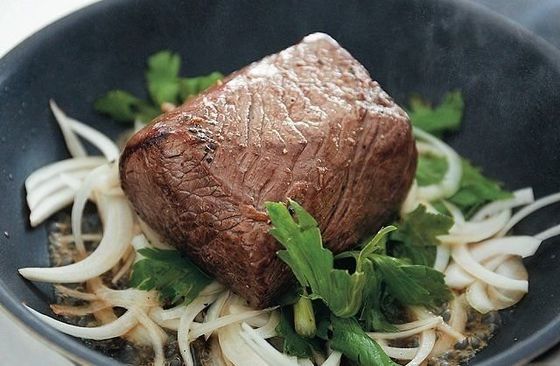 牛肉を一度取り出し、のフライパンに薄切りにした玉ねぎ、セロリの葉を広げる。牛肉を戻し入れて白ワインを回しかけ、アルミホイルでぴったりとふたをする。弱火で10分加熱し、火を止めて10分蒸らす。
