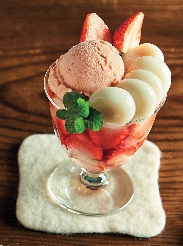 アイスクリームの合間に甘酸っぱいいちごとつるっ、もちっ!の白玉だんご。