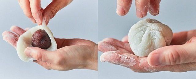 皮作りは電子レンジで簡単。いちごとあんを包んだ大福は柔らか~い、できたてを。