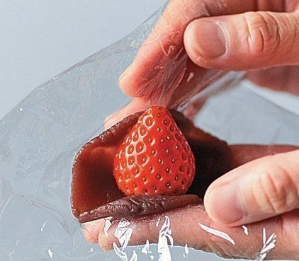 あんを4等分して丸め、ラップの上で平らに広げ、いちごを包んで丸める。