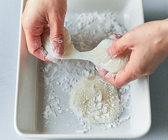 手にも片栗粉適量をつけて引っ張って丸く広げる。オーブン用シートの上に置けば、くっつきにくく、余分な片栗粉がつかない。