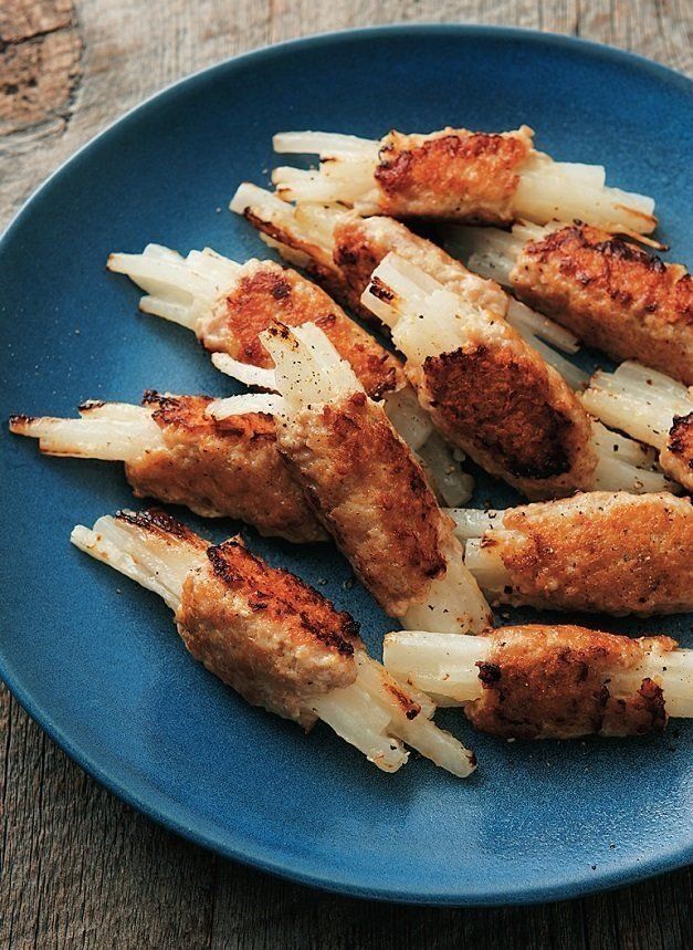 大根10cmは細切りにし、薄力粉少々をまぶして12等分する。豚ひき肉300gに溶き卵½ 個分、おろししょうが大½ 、片栗粉小1、塩小½ を加えて混ぜ、12等分し、大根を包むように肉だねをぎゅっとつける。