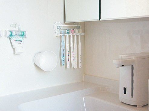 「以前は丸いスタンドに家族5人バラバラに立てていましたが、スタンドが洗面台に触れる部分に水がたまり、掃除するのが面倒でした。これなら拭き掃除もラク!(kagiさん)