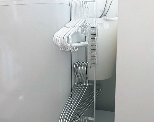 マグネットで洗濯機の側面に簡単に取りつけられ、かさばるハンガーをまとめて収納できる。付属のねじで壁に設置することも可能。色は白、黒の2色展開。(幅6×奥行き8.5×高さ46cm)\2,484
