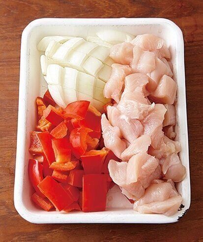 玉ねぎ、パプリカは2cm四方に切る。鶏肉は2cm角に切り、片栗粉をまぶす。