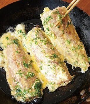 粗みじん切りの青じそ入りの卵液をからめて焼く。あじは粉をまぶしておくと卵液がはがれず、きれいにつけられる。