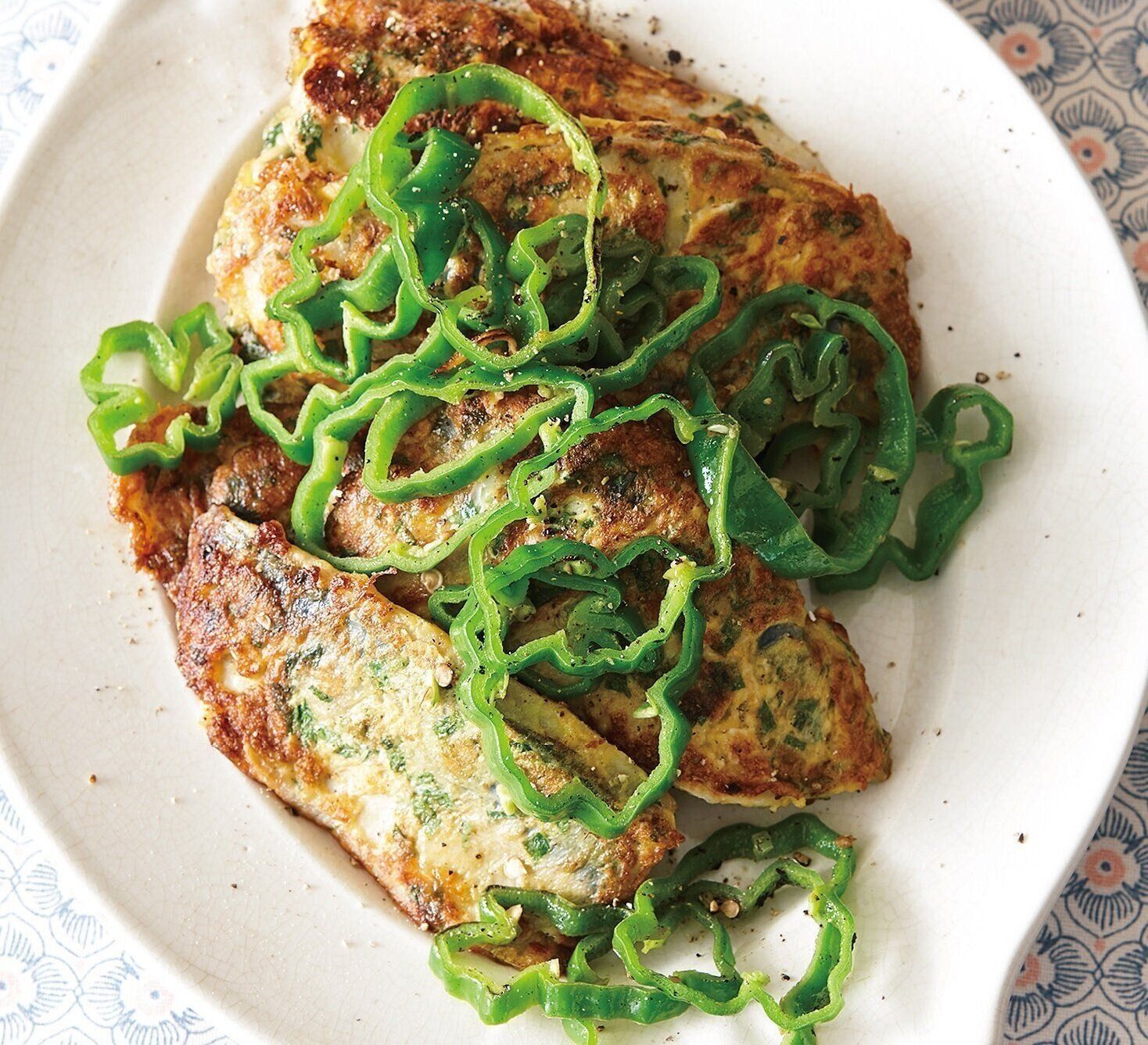 フライパンにオリーブ油を入れて中火にかけ、(1)のあじを(2)にくぐらせて入れて焼き目をつける。裏返してピーマンを加え、弱火にして7~8分焼き、器に盛る。黒こしょう少々をふる。