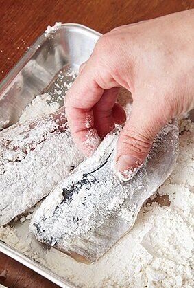 あじは塩小さじ2/3をふって10分おく。出てきた水分をペーパータオルで拭き、小麦粉をまぶす(写真)。ピーマンは種を取り、横に幅5mmに切る。