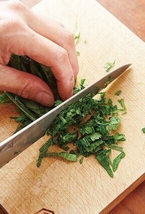 青じそは粗みじん切りにする(写真)。ボウルに[A]を合わせて青じそを加える。
