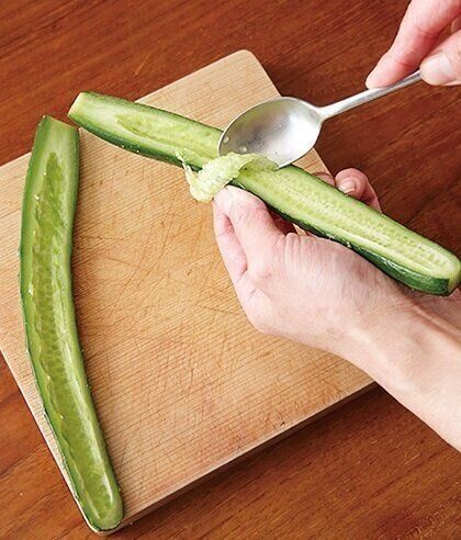 きゅうりは種を取っておくと、水けが出にくくなるので、たれが水っぽくならず、食感も楽しめる。