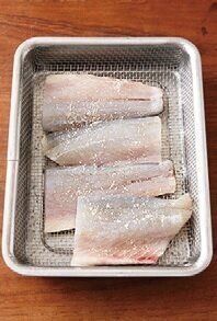 いさきはうろこを削り落とし、1枚を半分に切って塩小さじ2/3をふり、10分おく(写真)。出てきた水分をペーパータオルで拭き、小麦粉をまぶす。