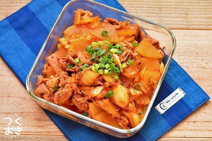 メインにぴったりのキムチプルコギ。豚バラ肉は下味をつけて、しっかりめの味つけに仕上げます。お好みで野菜をアレンジしたり、キムチの量を調節したりするのもよいですね。