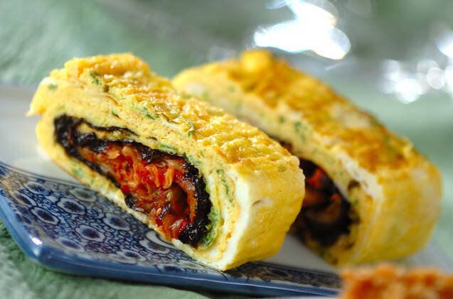 卵の中にのりとキムチを包んだ、キムチ入り卵焼きのレシピ。辛いものが苦手という人でも、マイルドで食べやすいメニューです。キムチが大きい場合は、ザク切りにしてから包んでくださいね。
