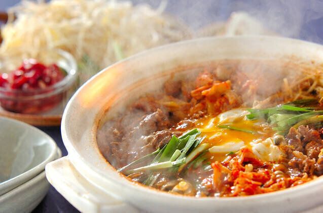 ピリ辛風味で元気になりたいときにぴったりのビビン鍋です。牛肉は焼肉のタレをもみ込んでうま味アップ!白菜キムチの食感もアクセントになりそうです。レシピによれば、ご飯、ラーメンとの相性も◎ですよ。