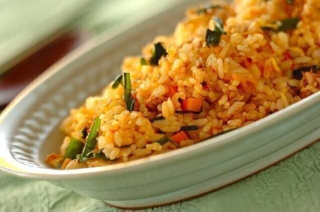 キムチとニラのパンチのきいた味つけが食欲をそそる、キムチチャーハンのレシピ。にんじんやツナなどいろいろな具材も入っているので、一皿でしっかり満足感を得られます。