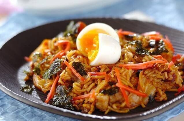 中華麵とご飯をどちらも味わえる、ボリューミーなそばめしレシピ。豚キムチのうま味が絶妙にマッチしそうです。仕上げに半熟卵をのせ、つぶしてからめて食べるのもおすすめ。紅ショウガの色味も鮮やかですね。
