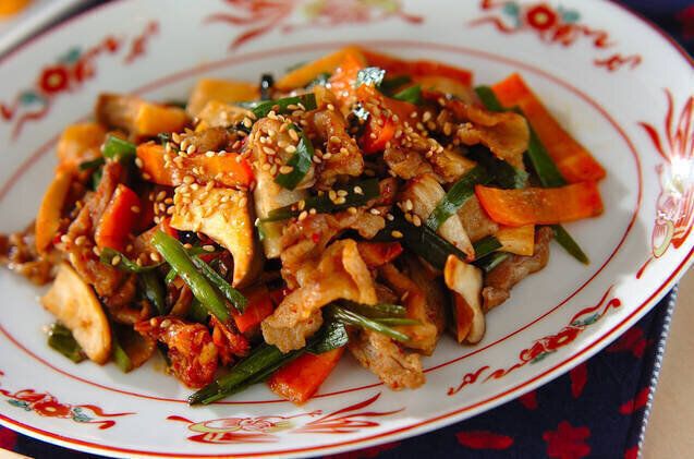 豚肉と野菜をたっぷり使った、ボリューム満点の豚キムチです。食材に醤油でしっかりと下味をつけておくのが、おいしさの秘訣。最後に追加するキムチは、火をとおしすぎずにさっと炒めましょう。