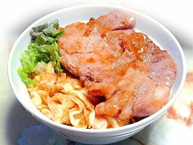 豚ロースでつくるトンテキを、丼にしたボリューム満点の一品です。にんにくを効かせたみそ味で、食べやすくなっています。野菜はお好みのもので大丈夫ですが、キャベツがおすすめですよ。