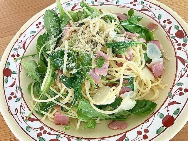 パーティーメニューにぴったりな、ボリューミーで華やかな見た目のペペロンチーノ風パスタ。パスタに絡んだルッコラのさわやかな苦みと、ベーコンの甘みがクセになる一品です。